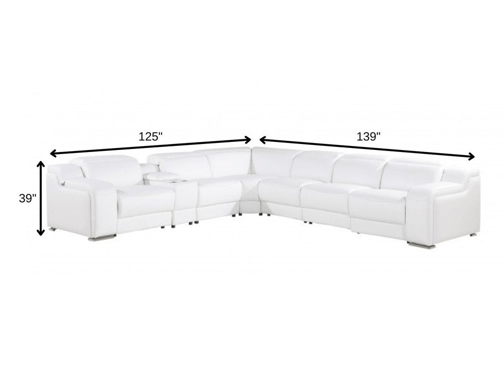 White Italian leather 3 power reclining seats L shaped Seven Piece Corner Sectional With Console